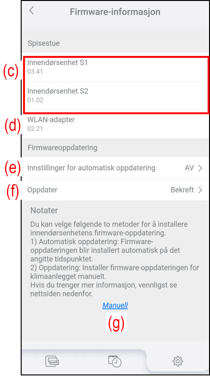 Se «Angi tidsplan for oppdatering av fastvare» for detaljer.(f) Update Trykk for å oppdatere fastvaren på klimaanlegget eller på WLAN-adapteren manuelt.