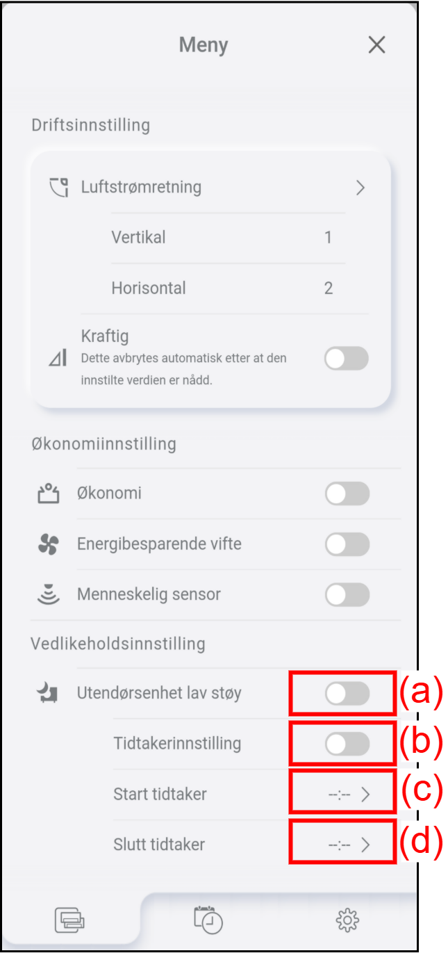 | (c) | Start timer | Trykk for å stille inn starttiden til timeren for stillegående drift for utendørsenhet. Stillegående drift for utendørsenhet starter til angitt tid. |