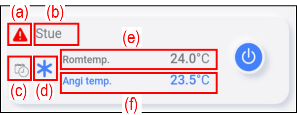 | (e) | Room Temp. (romtemp.) | Viser aktuell romtemperatur. |