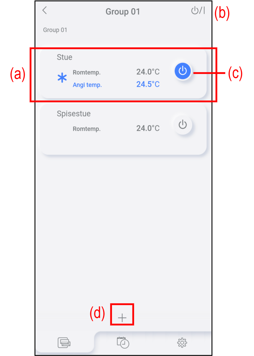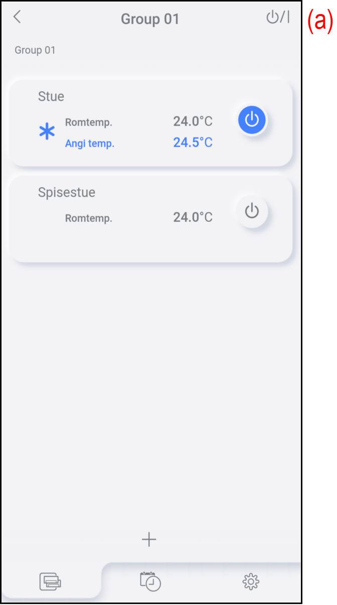 Trykk på (b) for å starte/stoppe driften av alle klimaanlegg i gruppen. Se «Start/stopp drift av alle» under for detaljer.