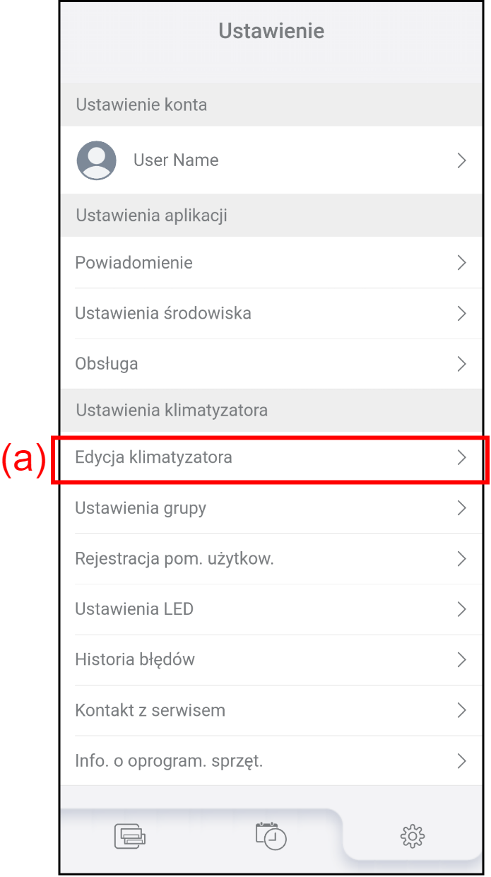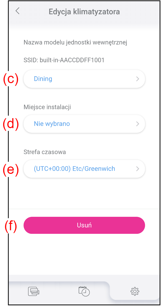 (c) Nazwa modelu jednostki wewnętrznej Dotknij, aby edytować nazwę jednostki wewnętrznej.