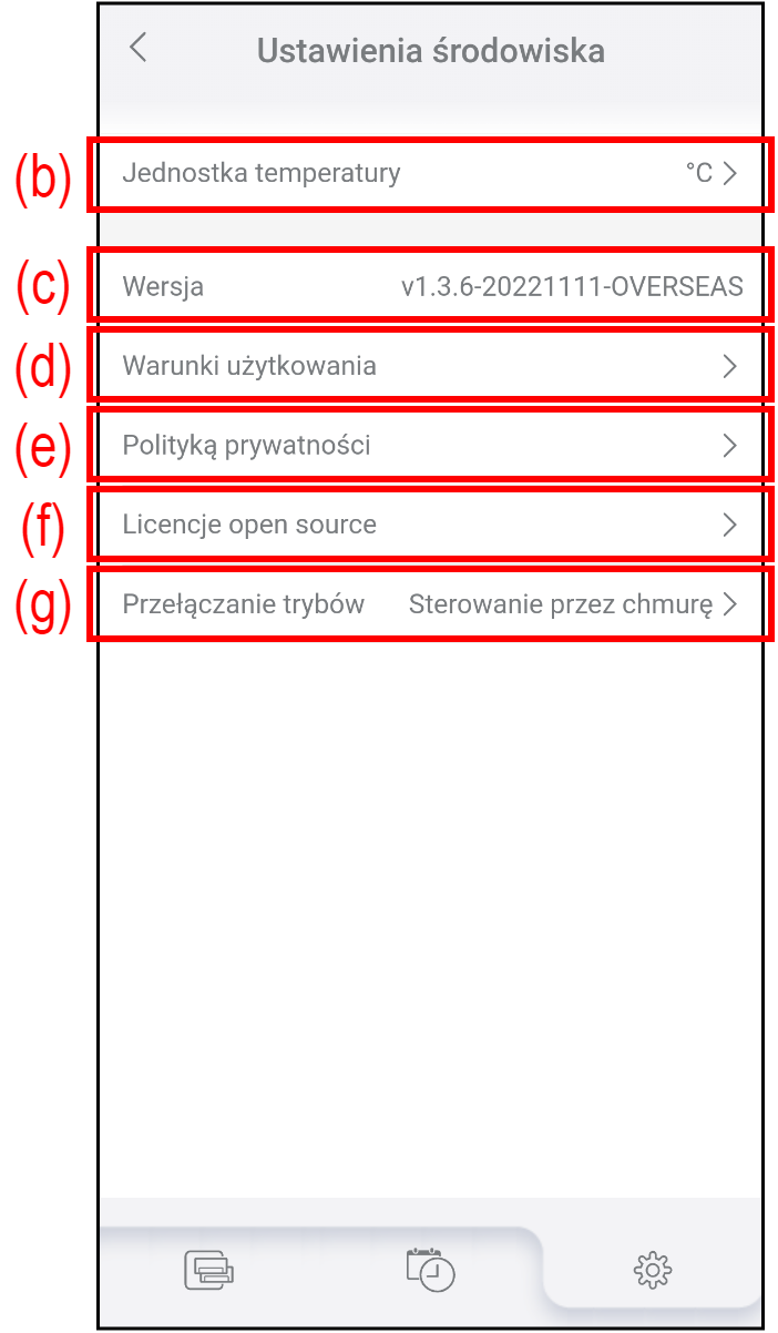 (c) Wersja Pokazuje aktualną wersję AIRSTAGE Mobile. (d) Warunki użytkowania Dotknij, aby sprawdzić najnowsze Warunki użytkowania dla usługi AIRSTAGE Mobile. (e) Polityka prywatności Dotknij, aby wyświetlić najnowszą Politykę prywatności usługi AIRSTAGE Mobile. (f) Licencja open source Dotknij, aby wyświetlić licencje open-source wykorzystywane przez AIRSTAGE Mobile. *Licencje open-source dostępne są tylko w języku angielskim. (g) Przełączanie trybów Dotknij, aby przełączyć tryb sterowania (Sterowanie przez chmurę lub Bezpośrednie sterowanie.)
