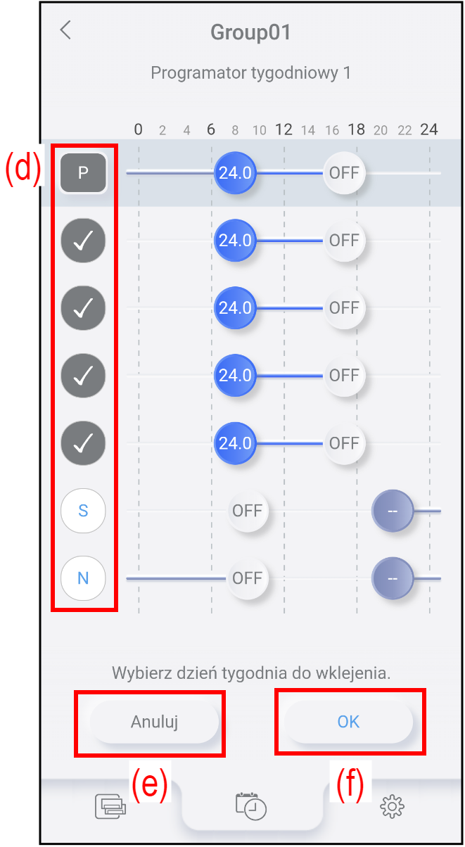 Ustawienia regulatora czasowego można skopiować z jednego dnia tygodnia na inny.