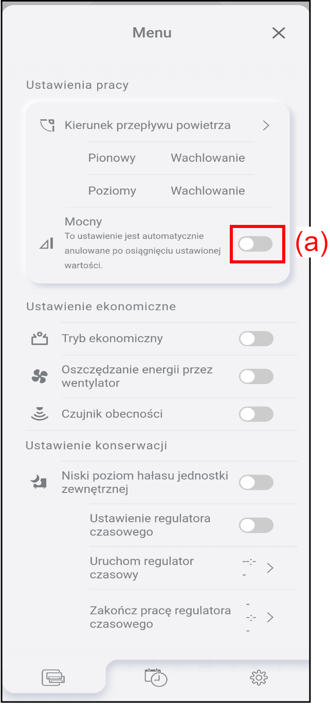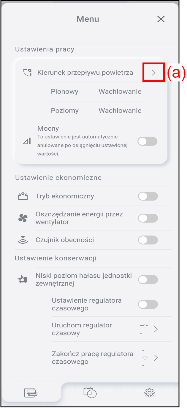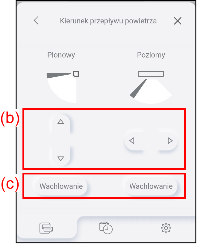 Dotknij (b), aby ustawić kierunek przepływu powietrza.