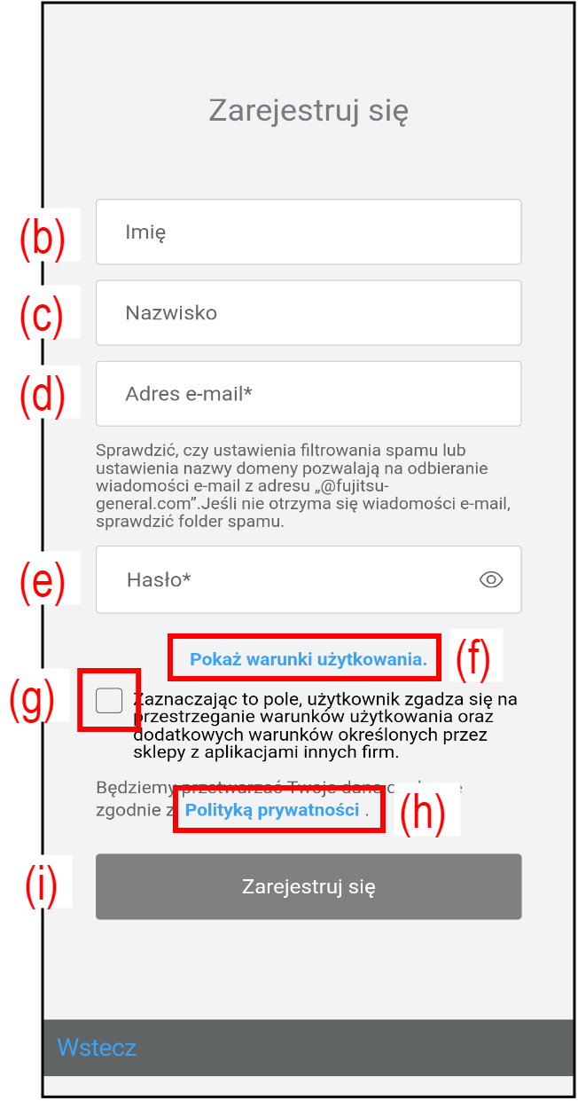4. Dotknij pole wyboru (g), aby zgodzić się na Warunki użytkowania.