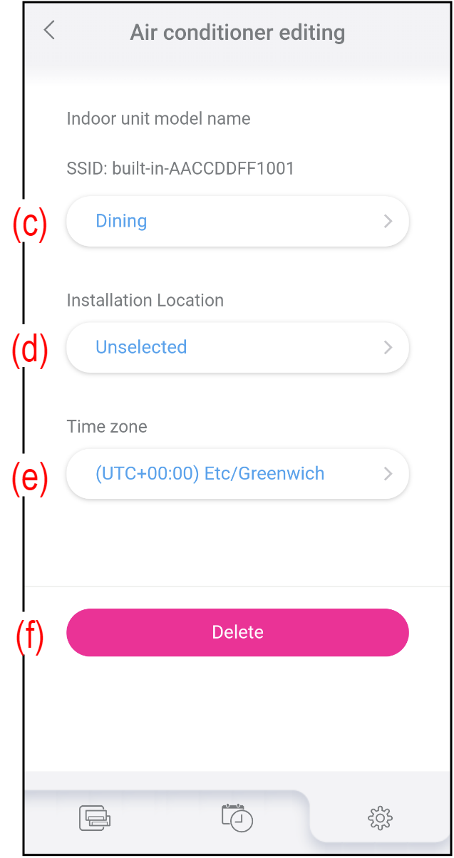(Modul de control poate fi schimbat în „Environment setting (Setarea mediului)”.)(d) Installation Location Atingeți pentru a selecta locația de instalare a aparatului de aer condiționat. (e) Time zone Atingeți pentru a selecta fusul orar unde se instalează aparatul de aer condiționat. Temporizatorul Weekly și Outdoor unit low noise funcționează în raport cu această setare. (f) Butonul [Delete] Atingeți pentru a șterge aparatul de aer condiționat înregistrat din contul dvs. Dacă atingeți acest buton, apare un mesaj de confirmare.