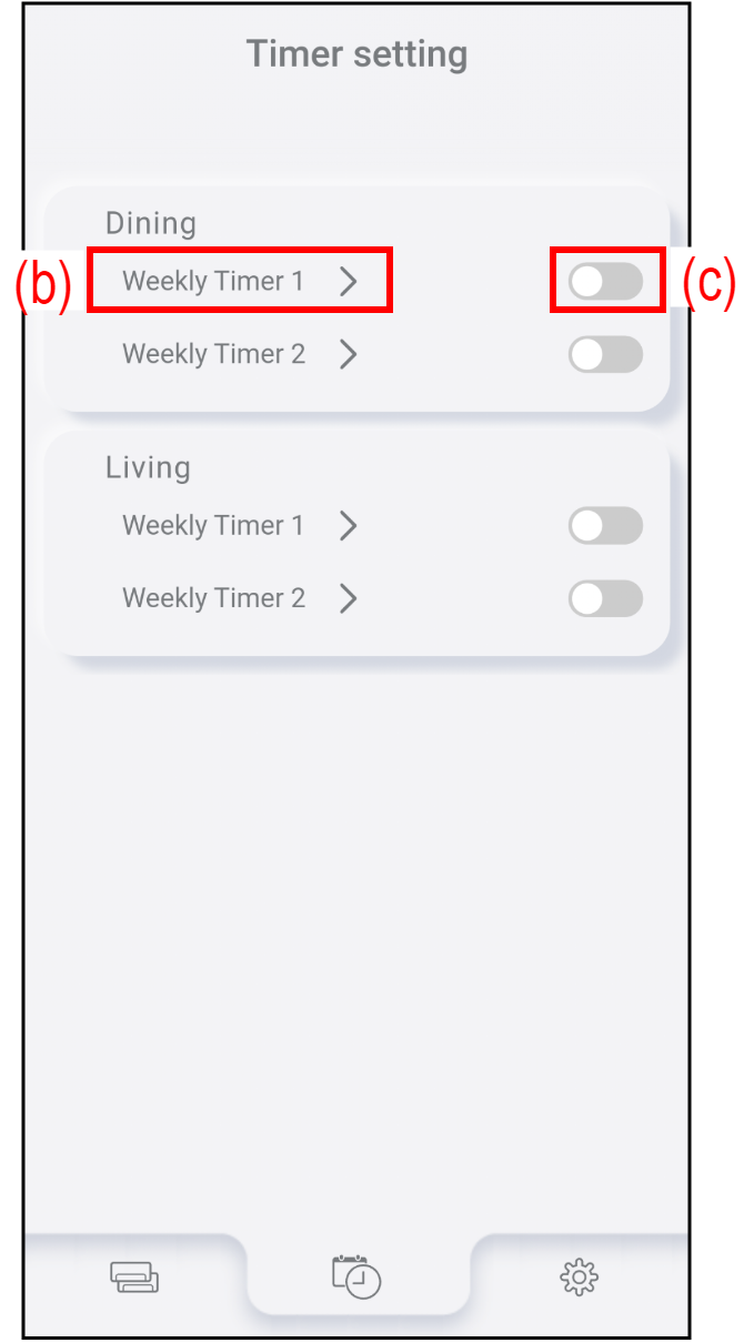 Atingeți (c) pentru a verifica sau edita setarea temporizatorului Weekly. Consultați „Procedura setării temporizatorului” pentru detalii.