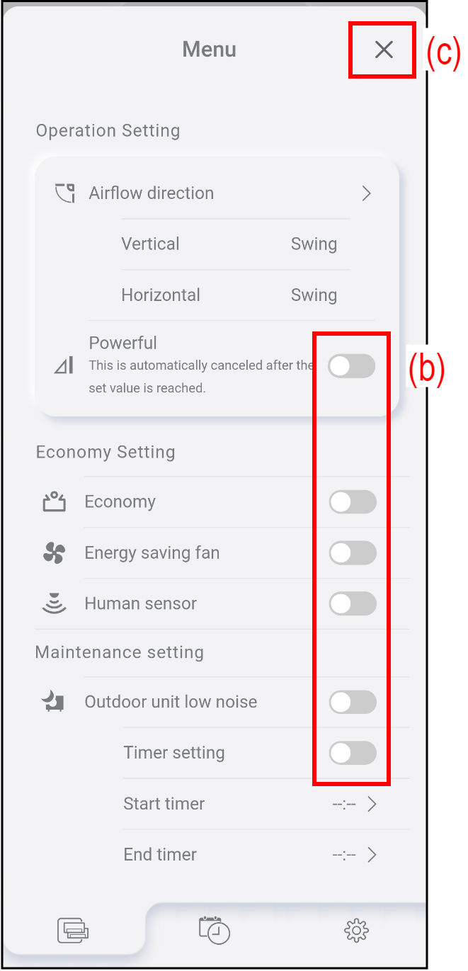 Atingeți (b) pentru a activa/dezactiva fiecare funcție.
