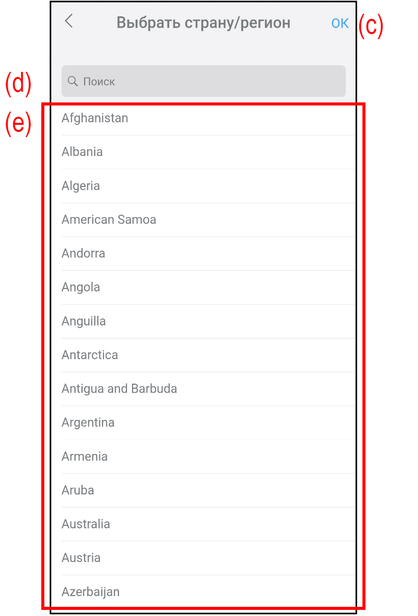 - Выберите свою страну/регион из списка (e). Для поиска страны/региона можете воспользоваться полем «Поиск» (d).
