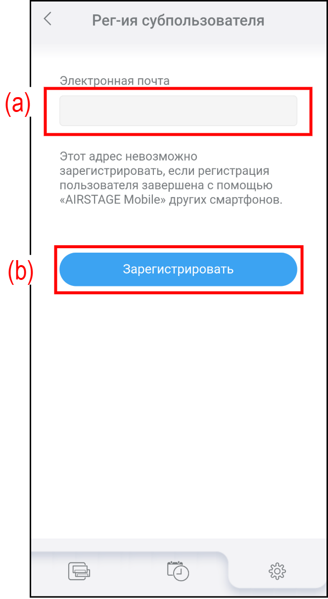 * Адрес электронной почты должен соответствовать действительной учетной записи AIRSTAGE Mobile. Заранее установите AIRSTAGE Mobile и создайте учетную запись на смартфоне субпользователя.