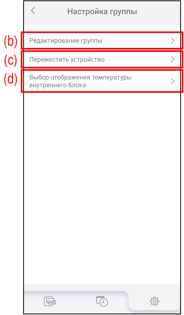 (b) Редактирование группы Нажмите, чтобы создать новую группу, изменить имя группы или удалить группу. Подробности см. в разделе «Редактирование группы». (c) Переместить устройство Нажмите, чтобы переместить кондиционеры воздуха в другую группу.