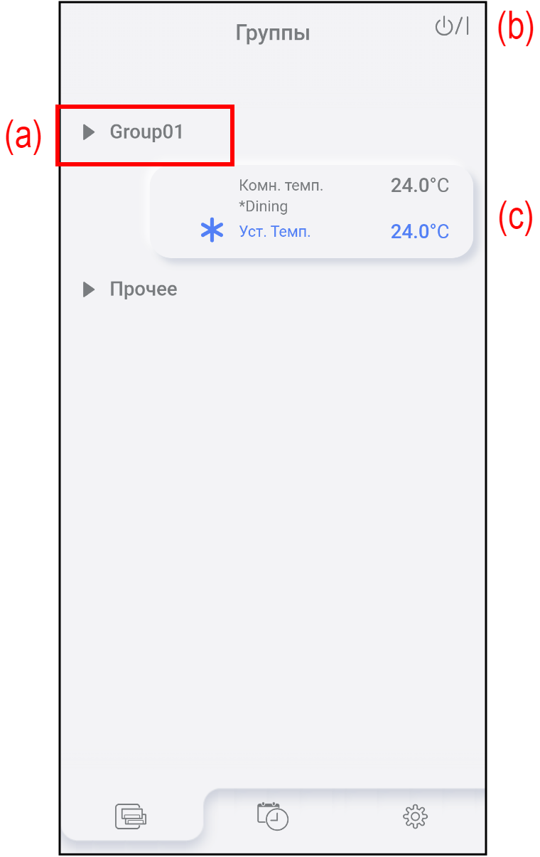 | (d) | Комн. темп. | Здесь отображается представительный кондиционер воздуха и температура в помещении, измеренная этим кондиционером. Вы можете установить внутренний блок-представитель на вкладке «Настройки» > «Настройка группы» > «Выбор отображения температуры внутреннего блока». |