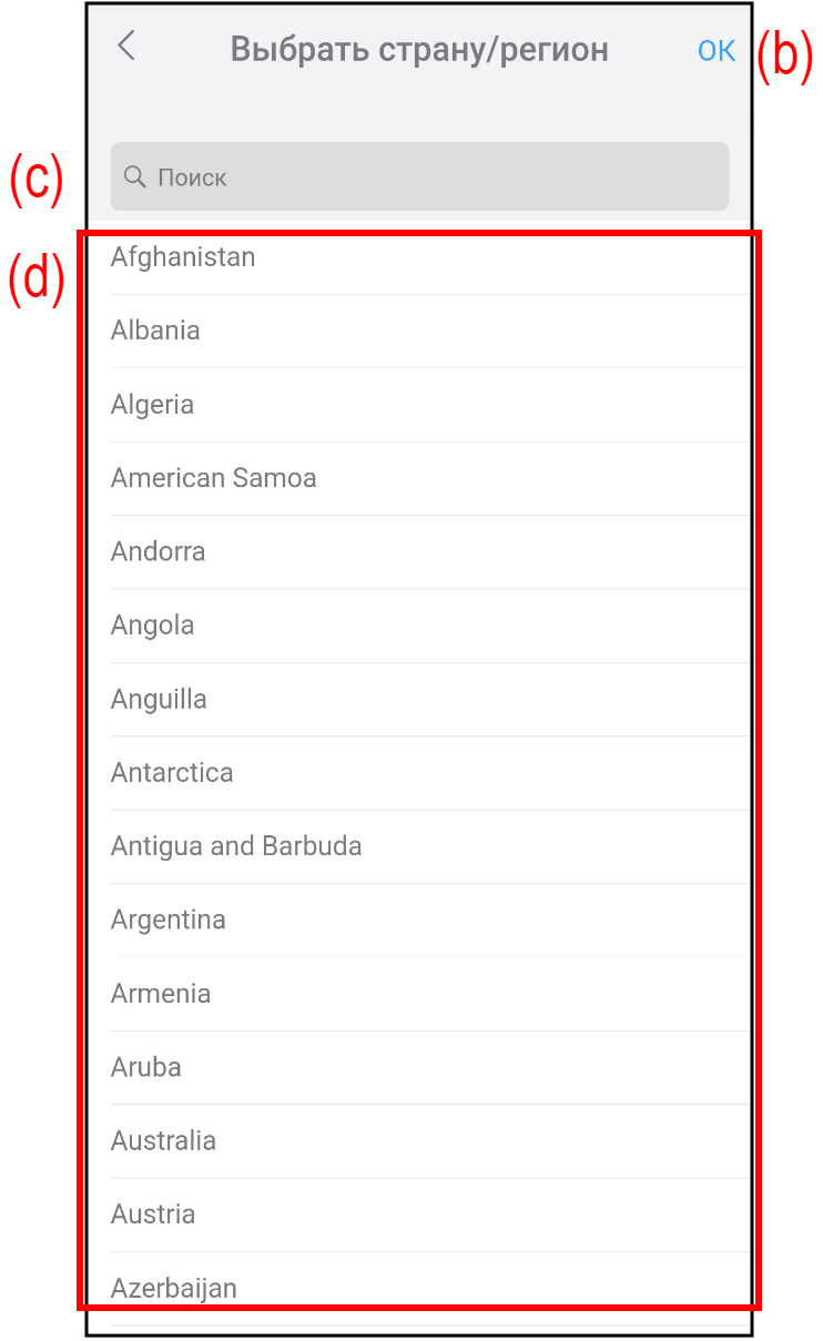- Выберите свою страну/регион из списка (d). Для поиска страны/региона можете воспользоваться полем «Поиск» (c).