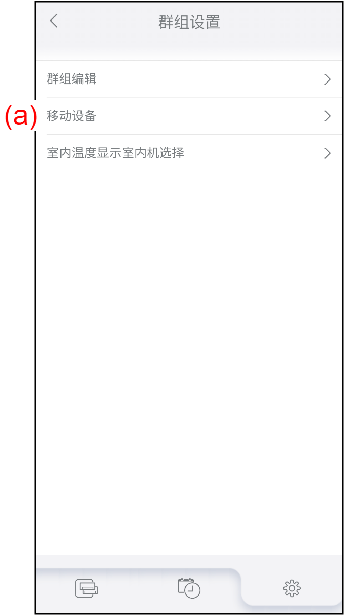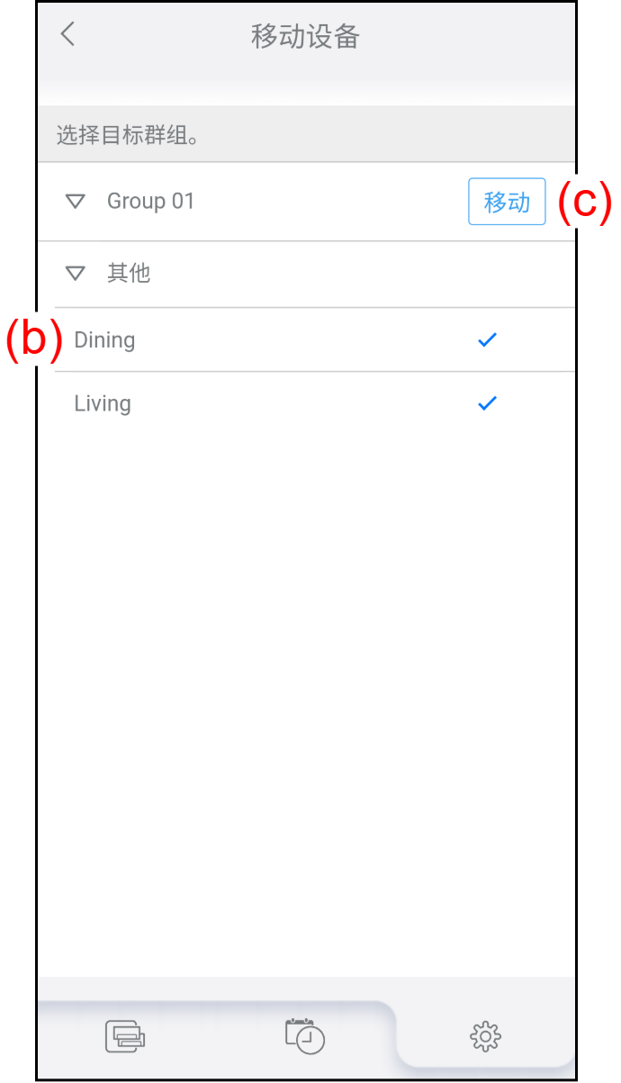 主页 设置 群组设置 将空调移动到另一个群组 轻按“群组设置”画面上的(a)以将空调移动到另一个群组。画面转至“移动设备”。 将出现空调列表画面。未注册到任何群组的空调处于“其他”中。 选择想要移动的空调(b)。[]表示所选空调。 轻按想要移动到群组的按键(c)。所选空调移动到群组。