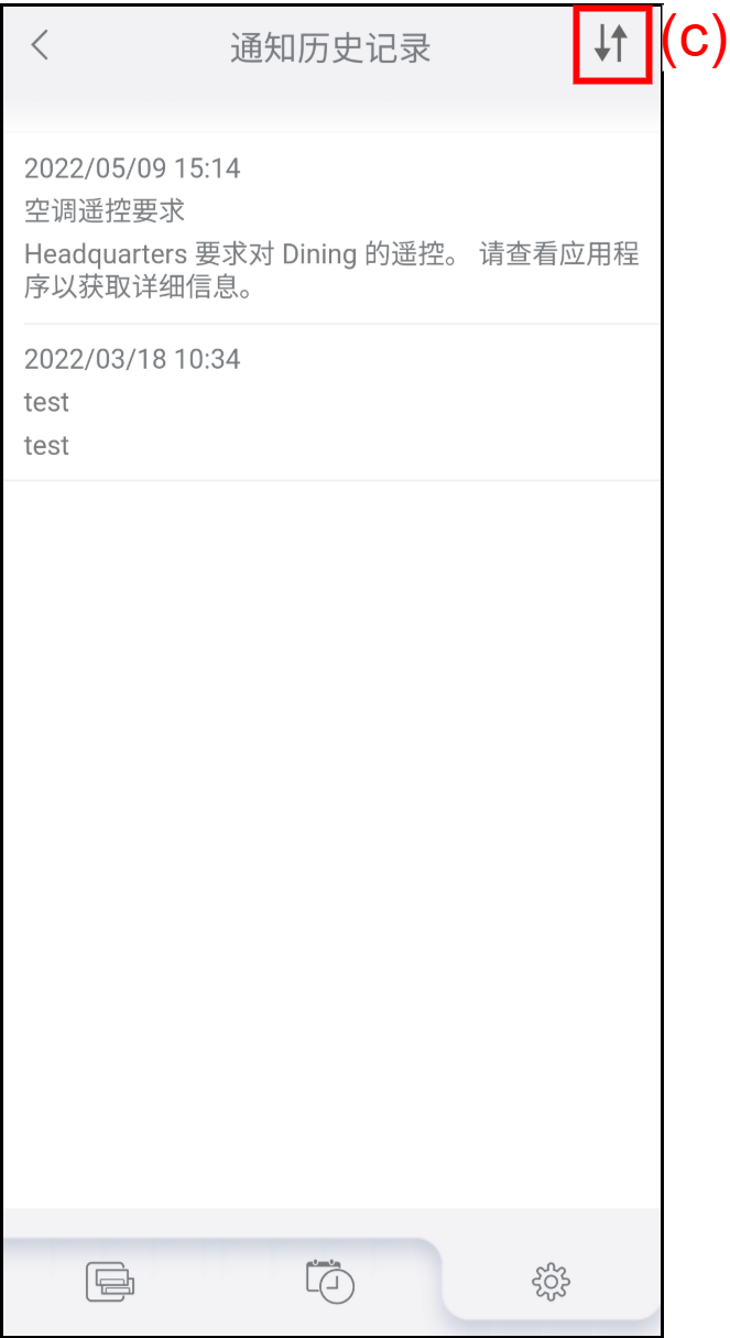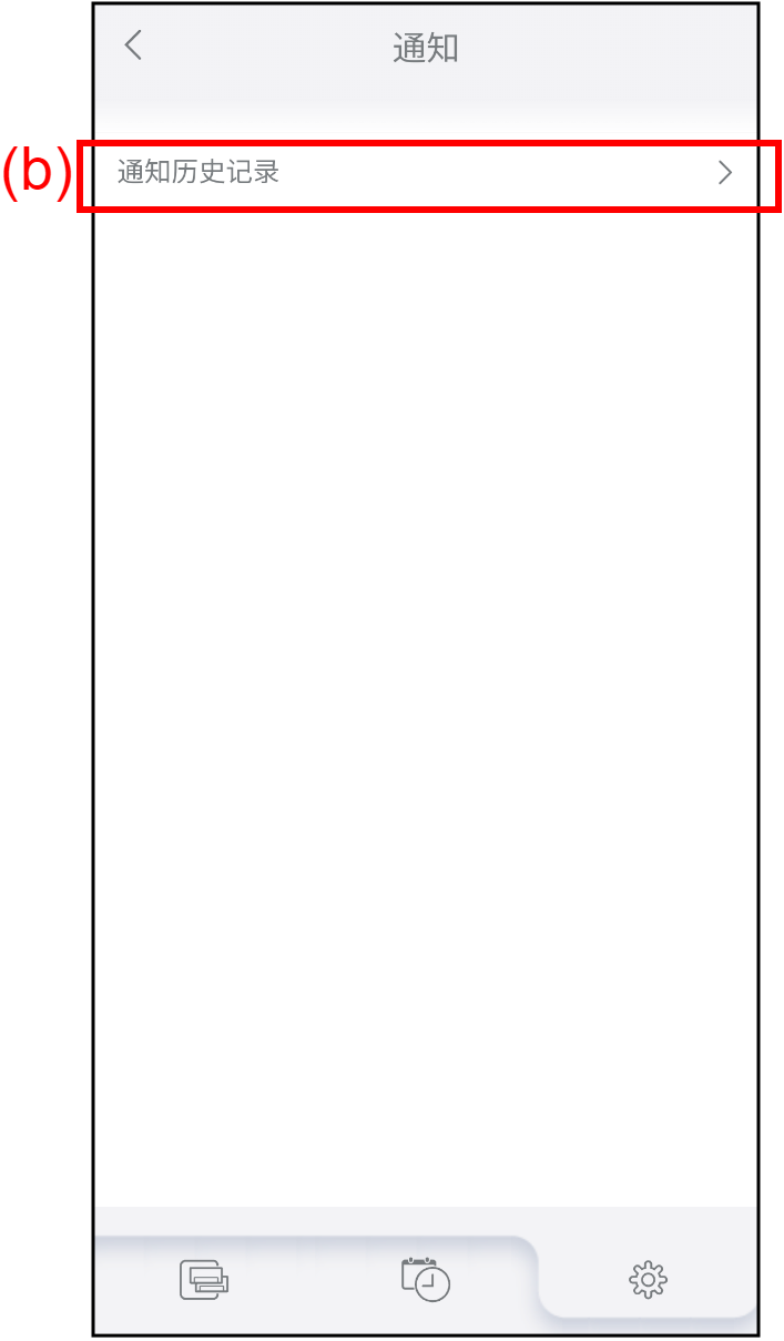主页 设置 通知 您可以检查您过去收到的通知。 注: 对于Sub users,该功能不可用。 轻按“设置”画面上的(a)检查过去的通知。画面转至“通知”。 轻按(b)显示通知列表。 通知历史记录按照首先显示最新记录的顺序显示。若要切换显示顺序,轻按(c)。