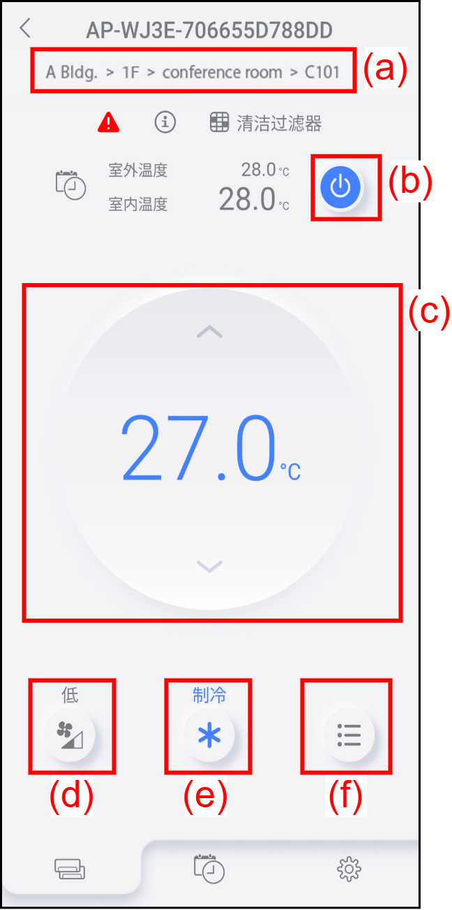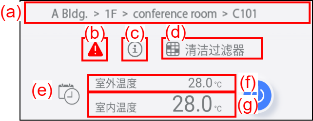 主页 主菜单 各空调画面 这是连接的每个空调的主画面。 (a) 空调名称 显示空调名称。 (b) 打开/关闭按键 轻按以打开/关闭空调运行。 (c) 温度设置 轻按或以更改温度设置。可设置的温度范围因空调而异。 注: 在送风模式下,不会显示温度设置。 在最低热量模式下,设置温度无法更改。 (d) 风扇转速设置 显示当前风扇转速。轻按此图标以更改风扇转速设置。(参考“风扇转速设置”。) (e) 运行模式设置 显示当前运行模式。轻按此图标以更改运行模式。(参考“运行模式设置”。) (f) 功能菜单按键 轻按此图标以设置空调功能。(参考“功能设置”。) <空调上的信息> (a) 群组名称 显示包括空调的群组名称。如果未设置群组,则不会显示该项目。 (b) 故障图标 显示发生了故障。参考“故障提示”了解详情。 (c) 信息图标 显示空调处于特殊状态。参考“特殊状态”了解详情。 (d) 清洁过滤器图标 显示需要进行过滤器清洁。参考“清洁过滤器”了解详情。 (e) 计时器图标 显示从Mobile应用程序设置的计时器。参考“计时器操作”了解详情。 (f) 室外温度 显示当前室外温度。 (g) 室内温度 显示当前室内温度。 注: 如果室外温度或室内温度超过下表,则会显示“--.-”来取代这些温度。 下限 上限 室外温度 -25°C (-13°F) 50°C (122°F) 室内温度 -10°C (14°F) 40°C (104°F) 取决于您的空调,当前室内温度可能不会出现在画面上。