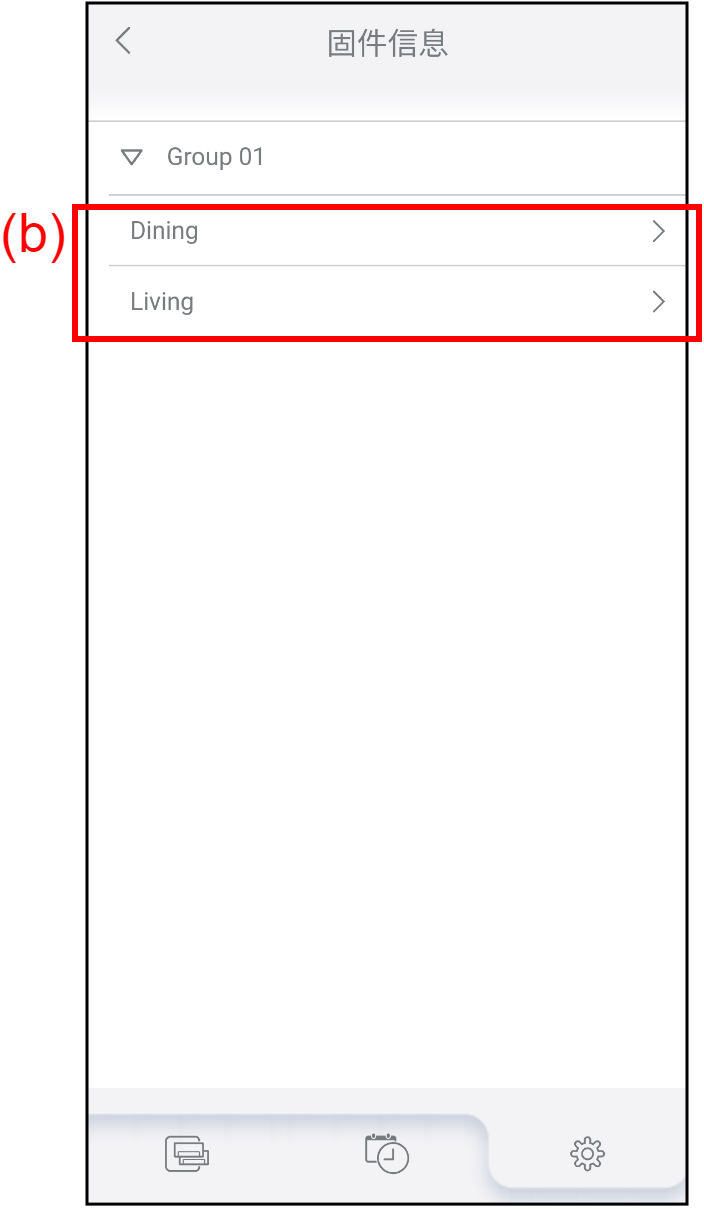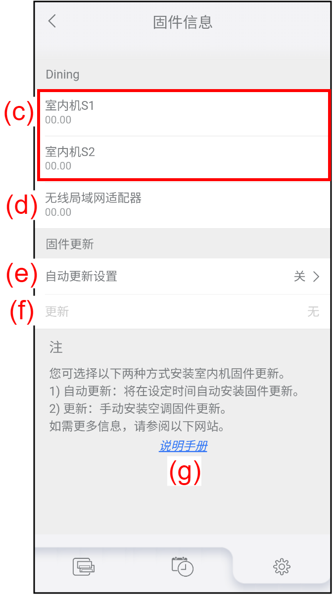 主页 设置 固件信息 可以检查无线局域网适配器和室内机的固件信息。 可以设置自动更新计划或者手动更新固件。 轻按“设置”画面上的(a)。画面转至“固件信息”。 轻按(b)以选择空调。轻按[]以显示注册的空调或从属群组。轻按[]以隐藏注册的空调或从属群组。 显示有关空调的固件信息。 (c) 室内机 显示室内机(软件1或软件2)的固件版本。 (d) 无线局域网适配器 显示连接到室内机的无线局域网适配器的固件版本。 (e) 自动更新设置 轻按以激活/禁用自动更新或者设置开始自动更新的时间。参考“设置固件更新的计划”了解详情。 (f) 更新 轻按以手动更新空调或无线局域网适配器的固件。参考“手动更新固件”了解详情。 (g) 说明手册 轻按说明手册即可显示本手册。 注: 取决于空调,有关室内机固件信息可能不会显示。在这种情况下,室内机的固件更新不可用。