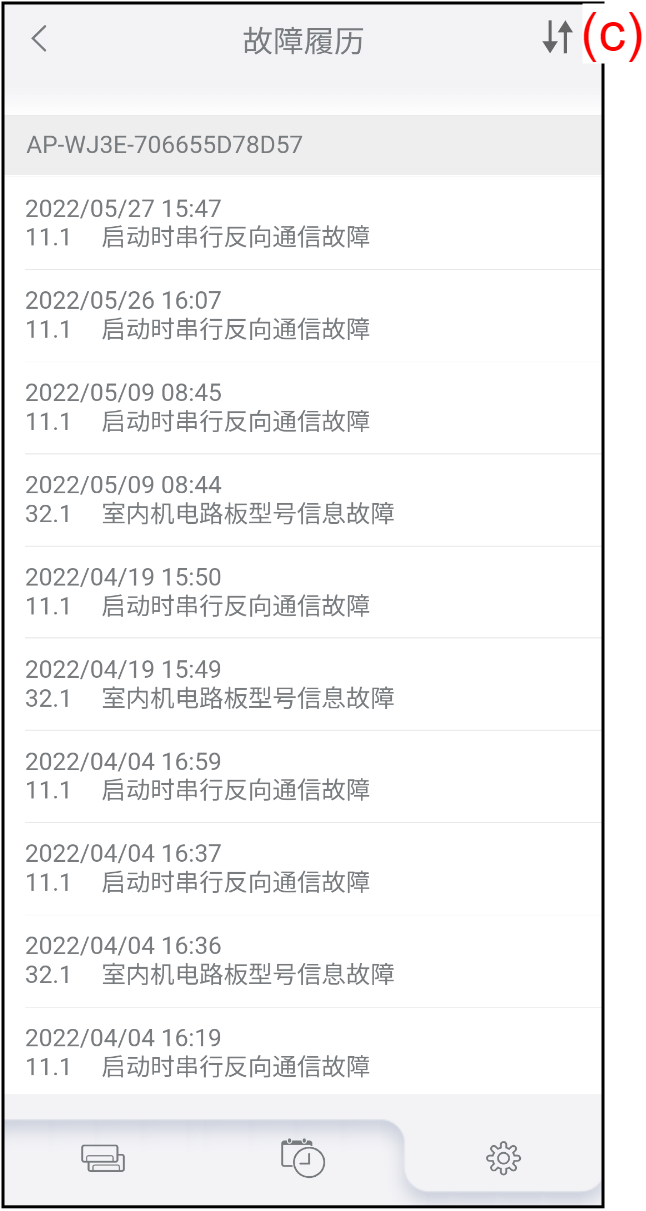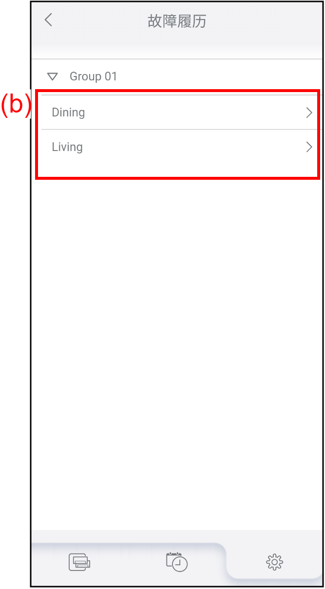主页 设置 故障履历 可以检查空调的故障履历。 轻按“设置”画面上的(a)以检查故障履历。画面转至“故障履历”。 轻按(b)以选择空调并检查故障履历。轻按[]以显示注册的空调或从属群组。轻按[]以隐藏注册的空调或从属群组。 空调的故障履历按照从最新到最旧的顺序显示。若要切换显示顺序,轻按(c)。