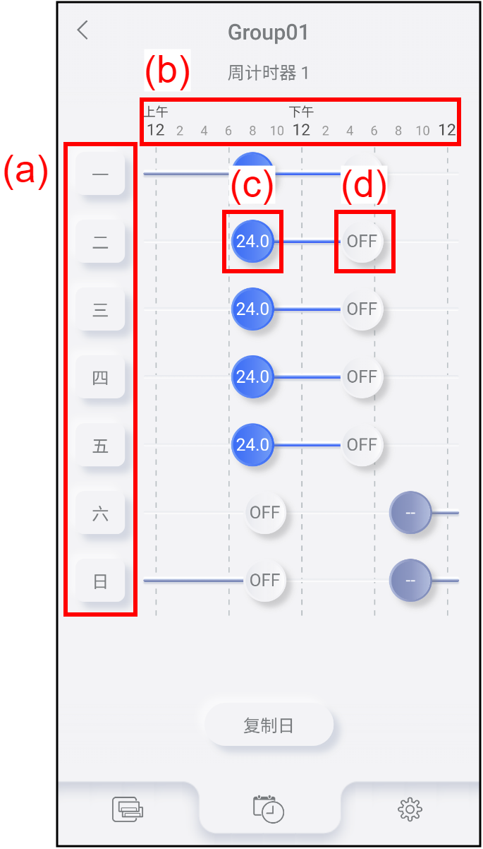 画面转至计时器编辑画面。可以将周中某日的计时器设置复制到另一天。(参考“复制计时器设置”。)