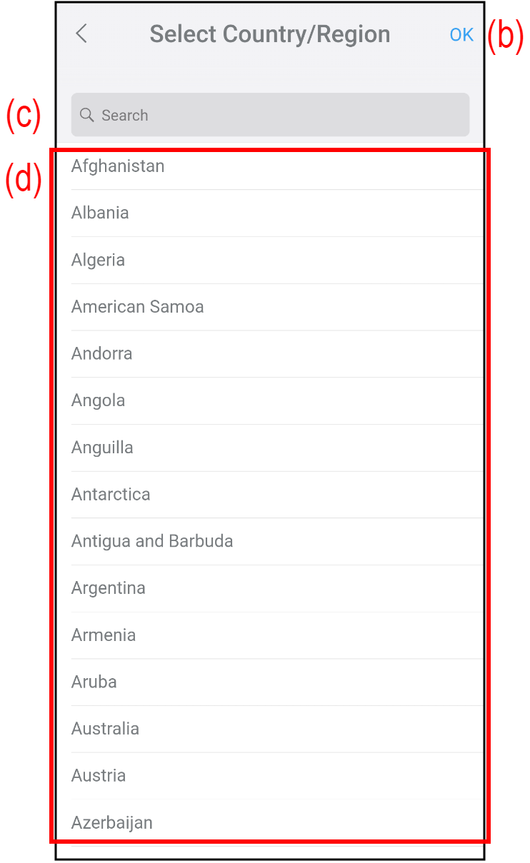 - Na seznamu izberite svojo državo/regijo (d). Državo/regijo lahko poiščete v razdelku »Search« (c).