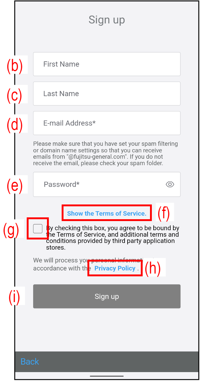 (b) First Name Vnesite svoje ime. (c) Last Name Vnesite svoj priimek. (d) E-mail Address Vnesite svoj e-poštni naslov. To bo uporabljeno kot vaš ID računa.