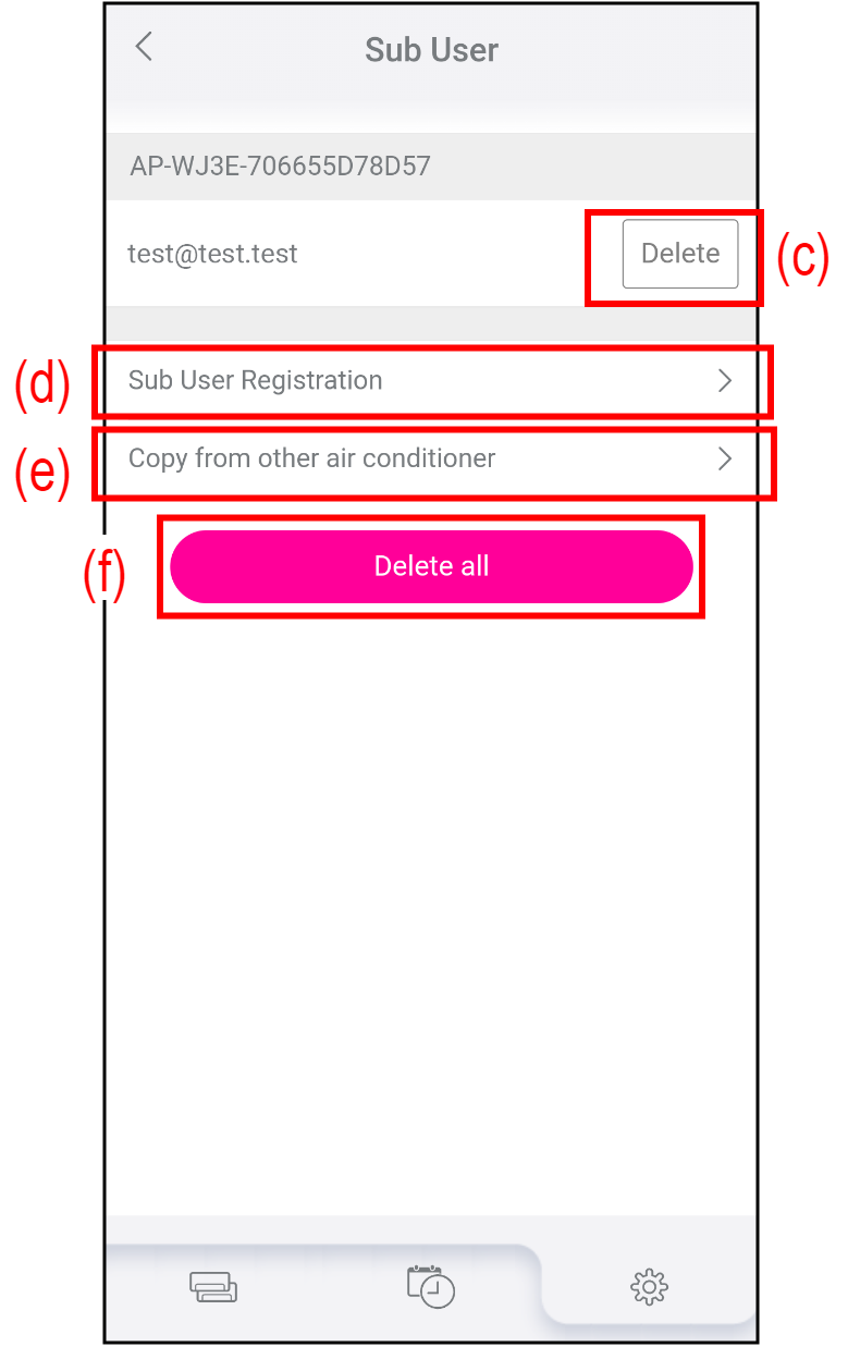 Če želite kopirati nastavitve podrejenega uporabnika iz druge klimatske naprave v to klimatsko napravo, se dotaknite (e). Glejte pod "Kopiranje nastavitev poduporabnika iz druge klimatske naprave."