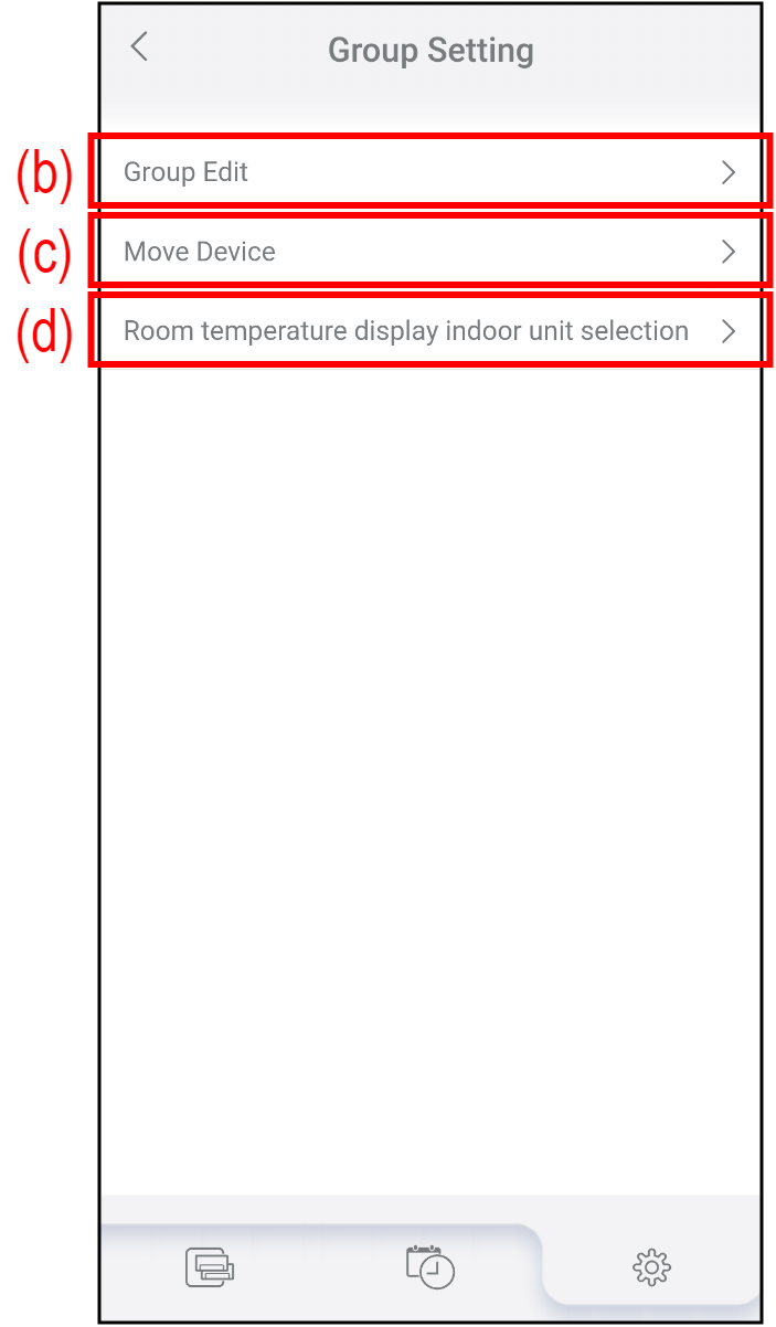(b) Group Edit Dotaknite se za ustvarjanje nove skupine, urejanje imena skupine ali brisanje skupine. Za podrobnosti glejte »Group editing (Urejanje skupine)«. (c) Move Device Dotaknite se za premikanje klimatske naprave v drugo skupino.