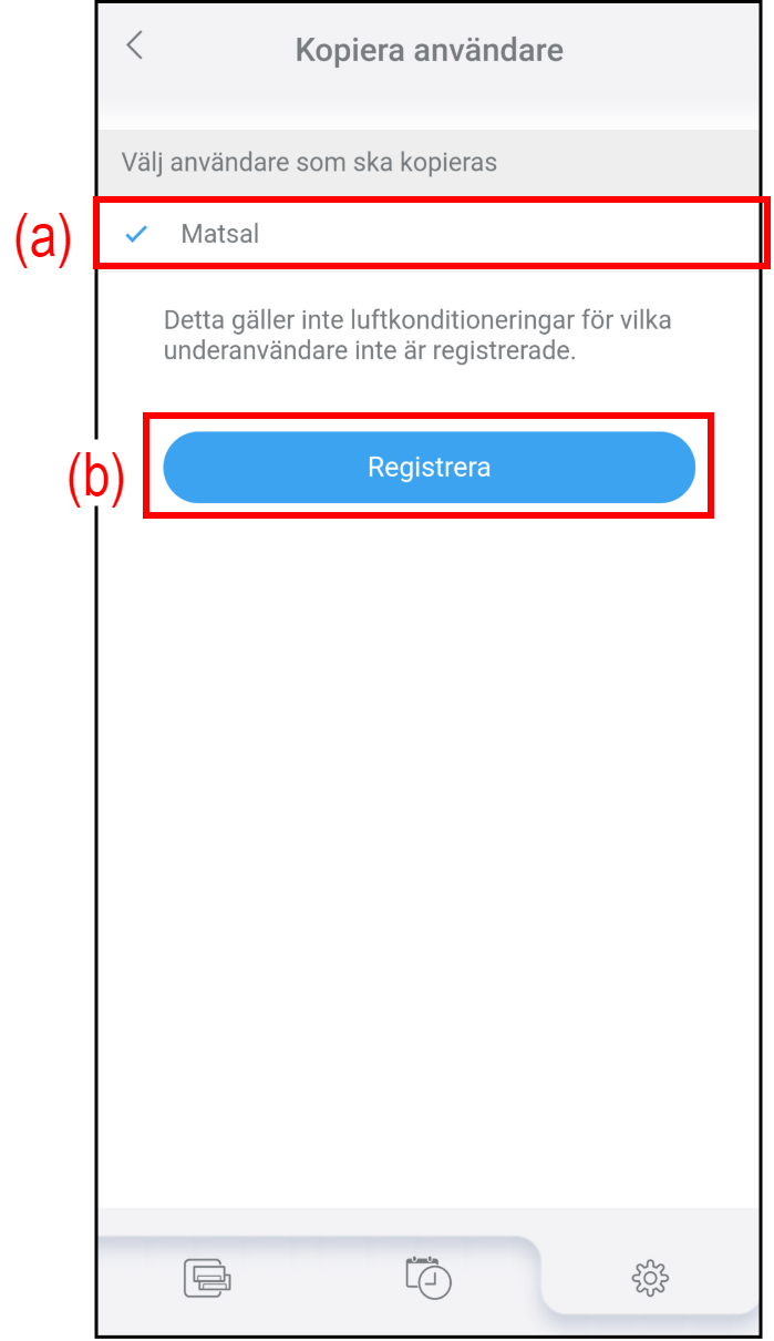 - Välj den luftkonditioneringsapparat (a) som du vill kopiera underanvändarinställningen från på skärmen ”Kopiera användare”.