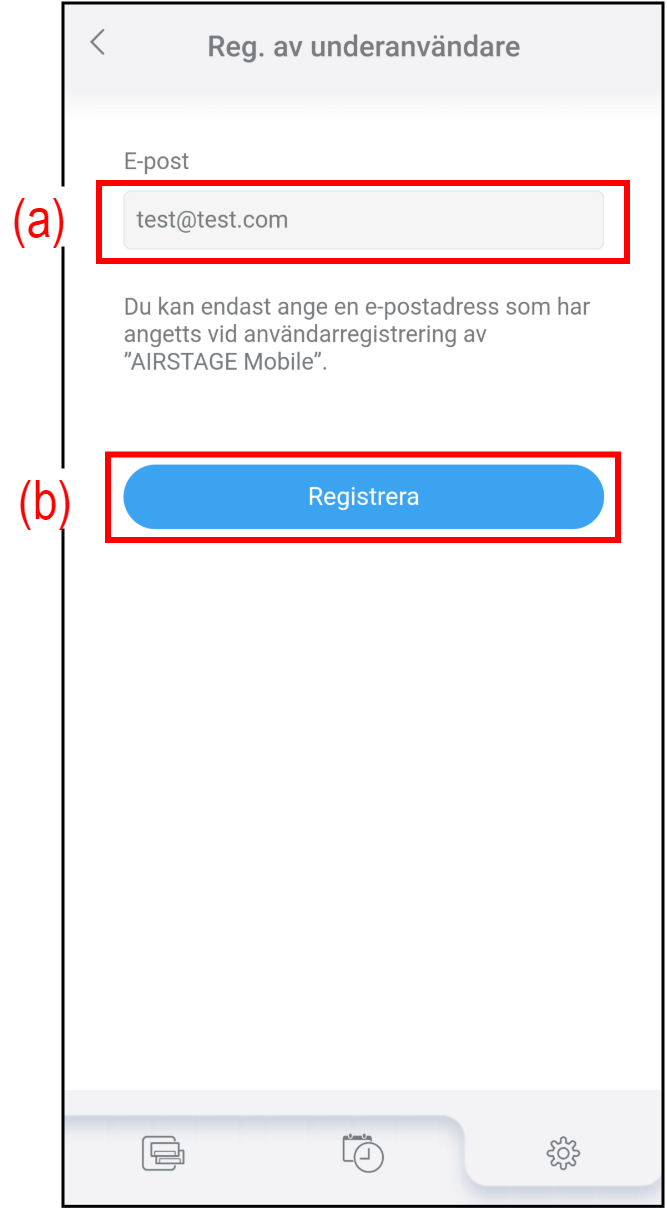 - Ange underanvändarens e-postadress i (a) på skärmen ”Reg. av underanvändare”.