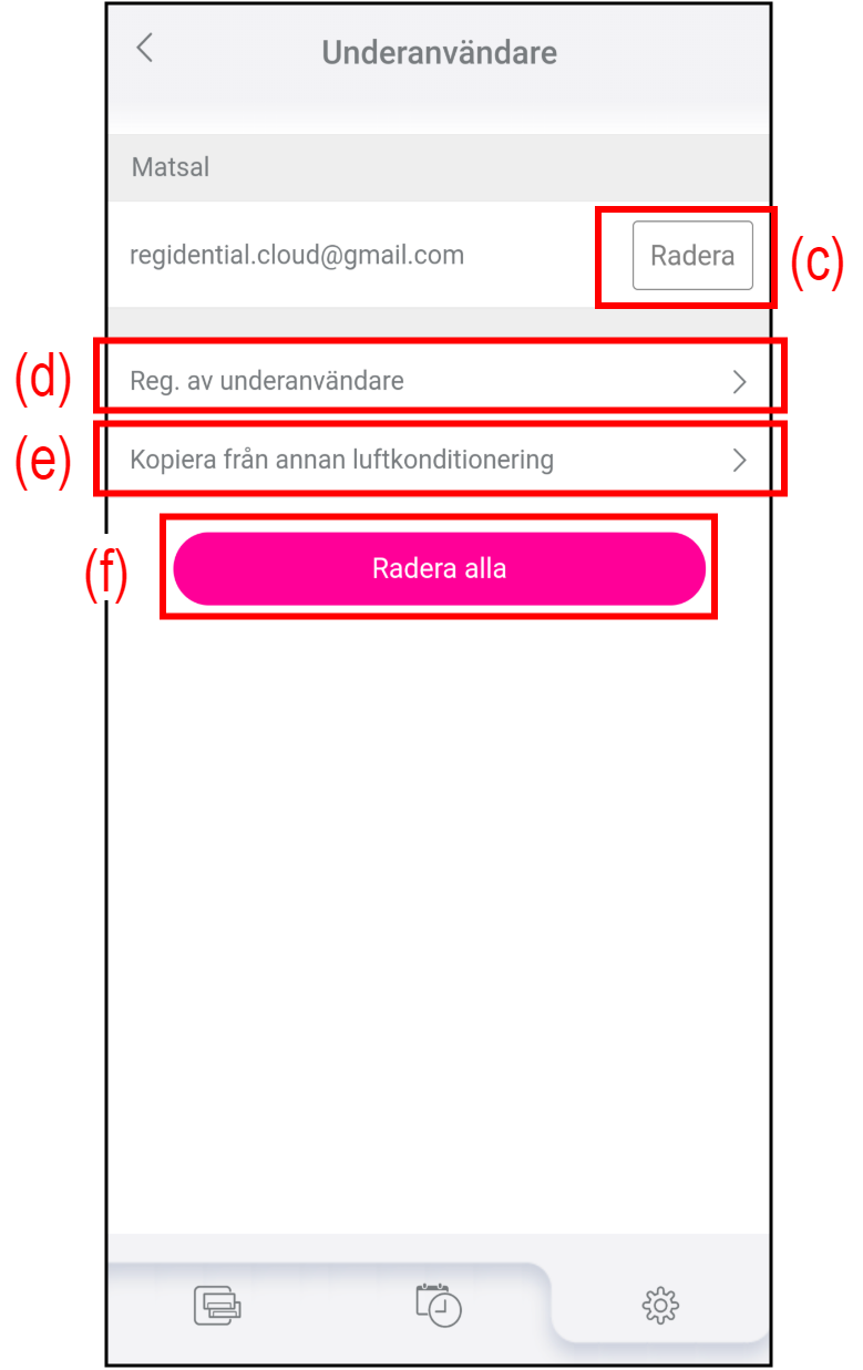 För att radera alla underanvändare som är registrerade för luftkonditioneringsapparaten trycker du på (f).