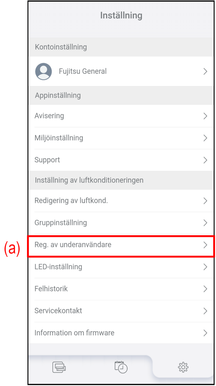 Tryck på (b) för att välja den luftkonditioneringsapparat till vilken du vill lägga till eller radera underanvändaren.