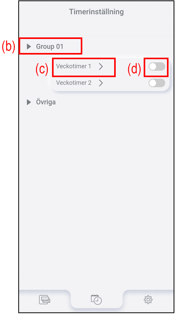 Tryck på (b) för att kontrollera eller redigera inställningarna för veckotimern. Se ”Timerinställningsprocess” för mer information.