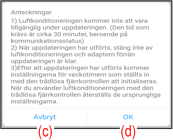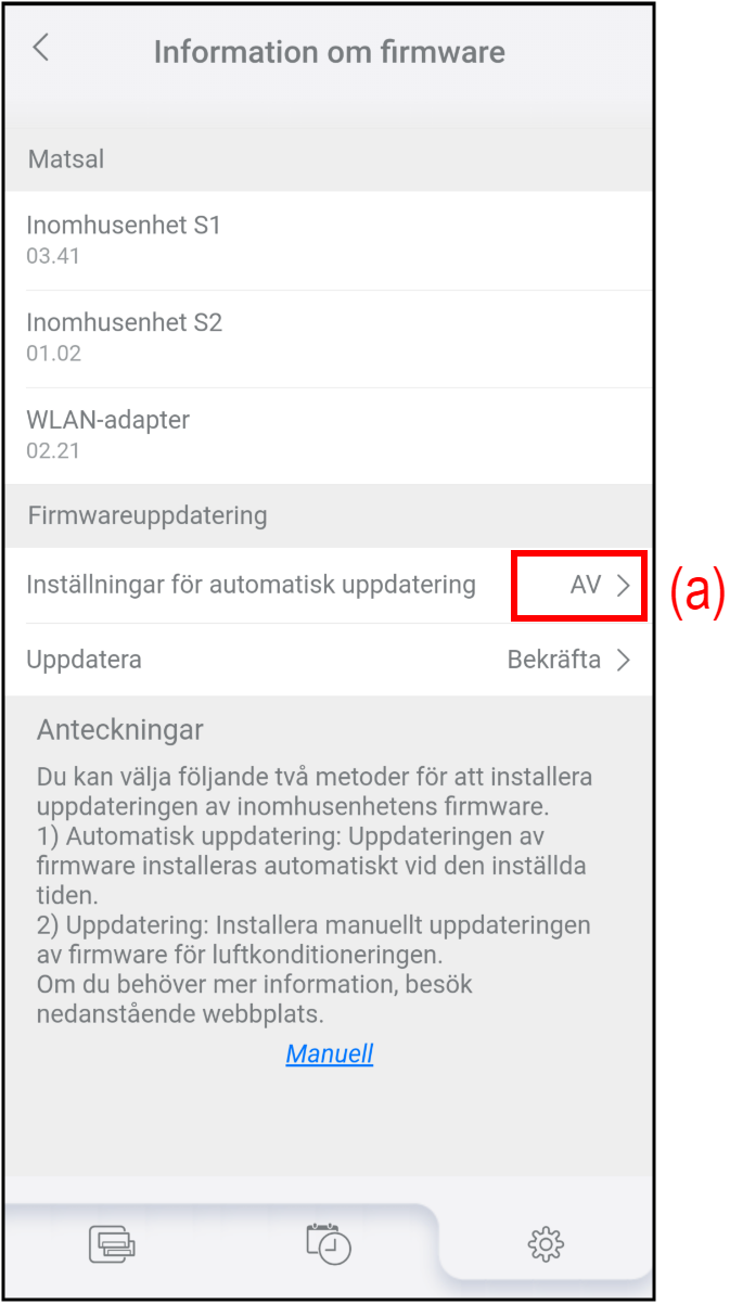 Du kan ställa in tiden för att starta den automatiska uppdateringen av luftkonditioneringsapparatens och den trådlösa nätverksadapterns fasta programvara.