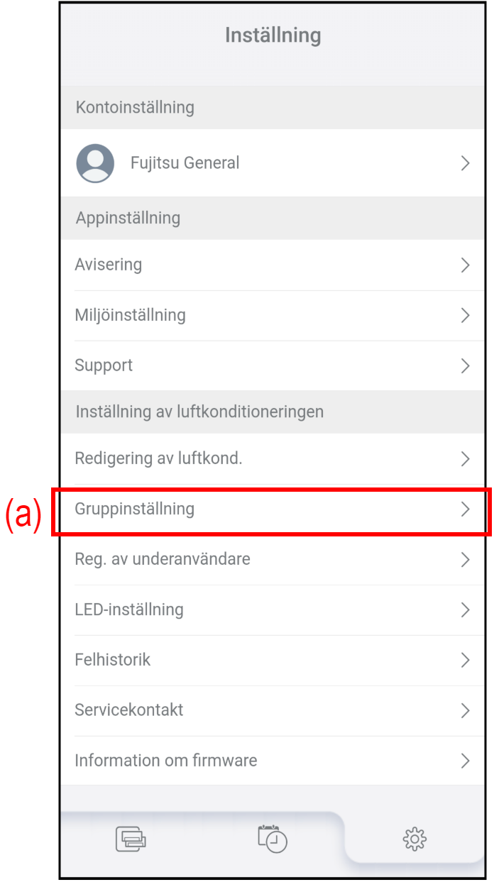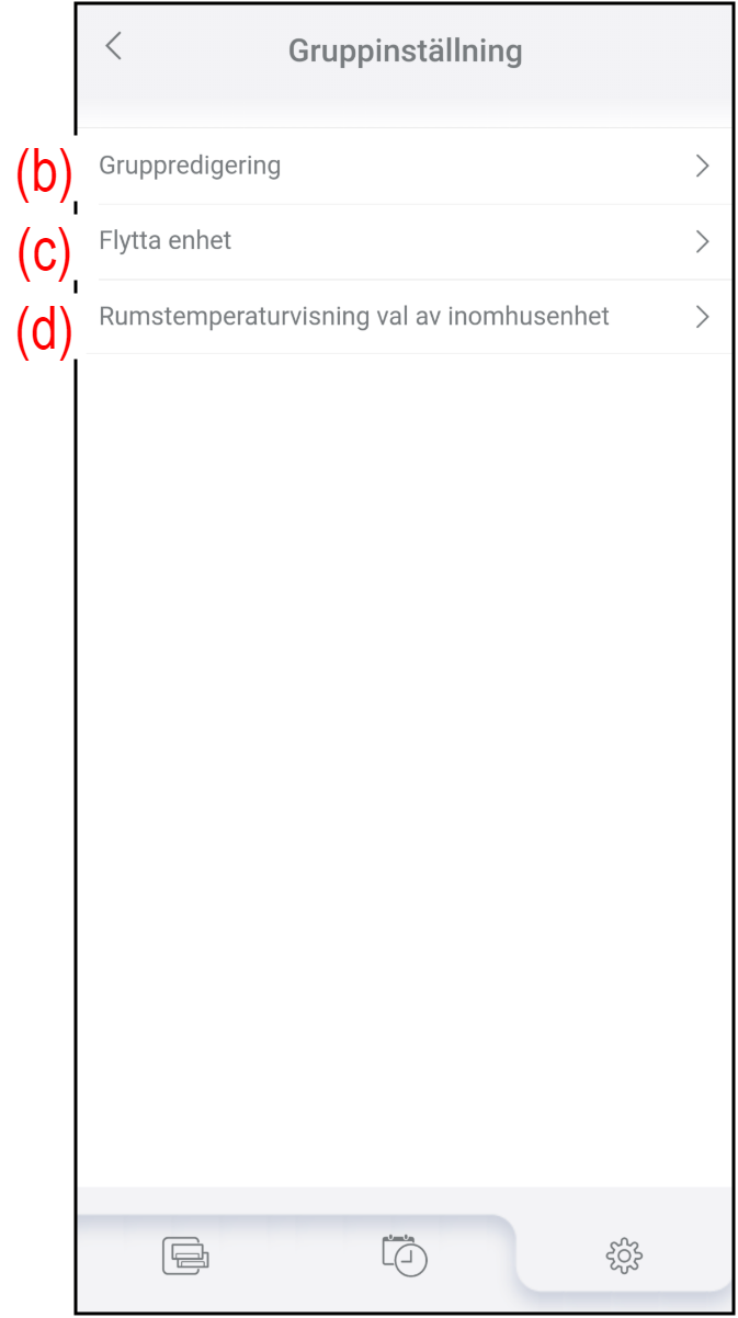 (b) Group Edit Tryck för att skapa en ny grupp, redigera gruppnamnet eller ta bort gruppen. Se ”Group editing (Gruppredigering)” för mer information. (c) Move Device Tryck för att flytta luftkonditioneringsapparater till en annan grupp.