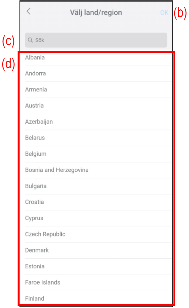 - Välj land/region i listan (d). Du kan söka efter landet/regionen i ”Search” (c).