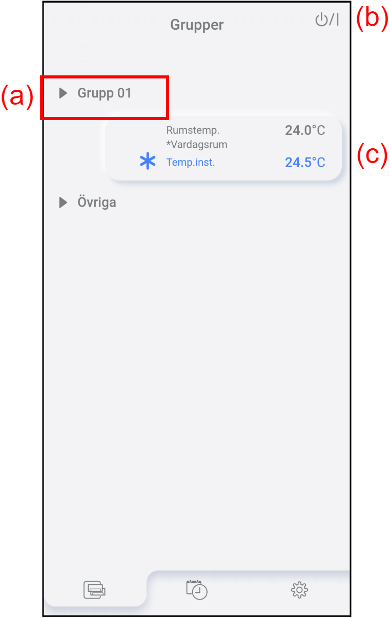 | (a) | Gruppnamn | För att kontrollera luftkonditioneringslistan i gruppen, tryck här. Se ”Luftkonditioneringsapparatens listskärm” för mer information. |