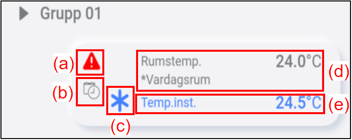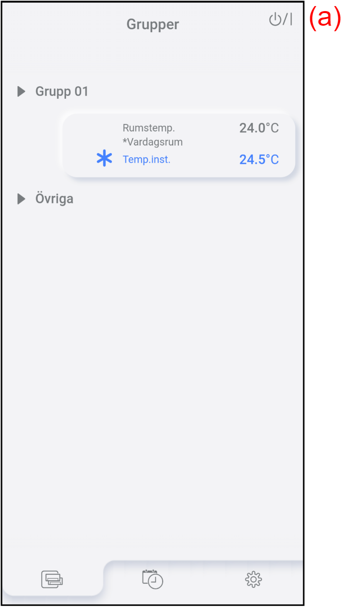| (d) | Room Temp. | Den visar den representativa inomhusenheten och rumstemperaturen uppmätt av den representativa inomhusenheten. Du kan ställa in den representativa inomhusenheten från inställningsfliken > ”Group Settings” > ”Room temperature display indoor unit selection”. |