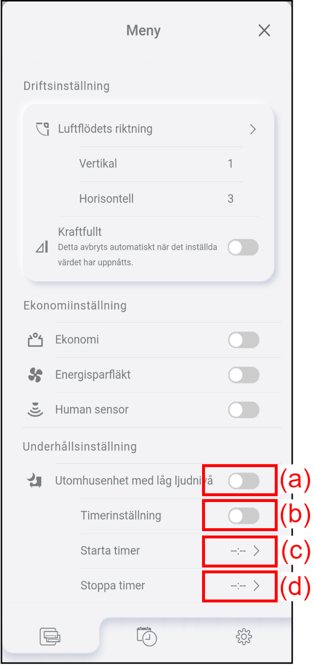 | (c) | Start timer | Tryck för att ställa in starttiden för utomhusenhetens ljudreduceringstimer. Ljudreducering för utomhusenhet startar vid inställd tid. |