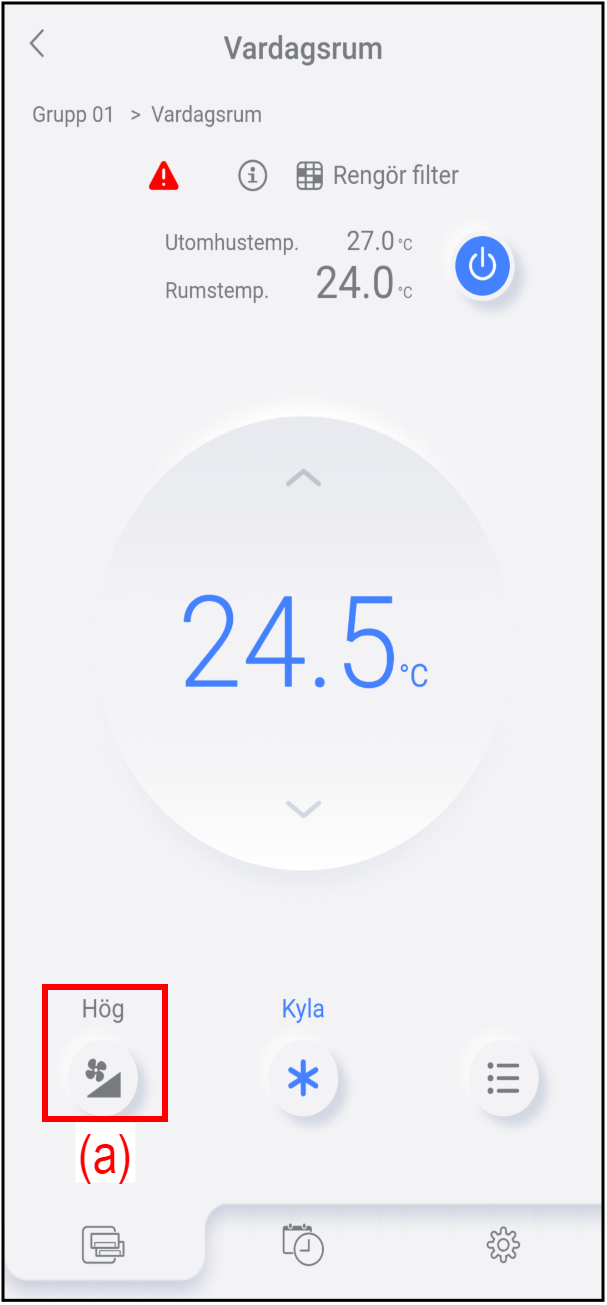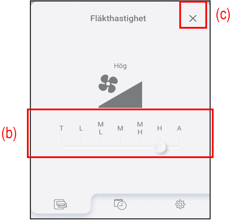 Justera reglaget (b) för att ställa in fläkthastigheten.