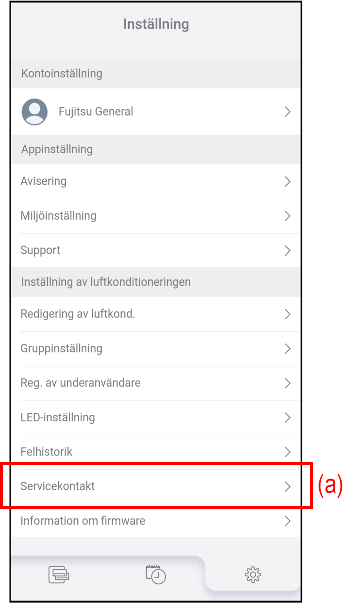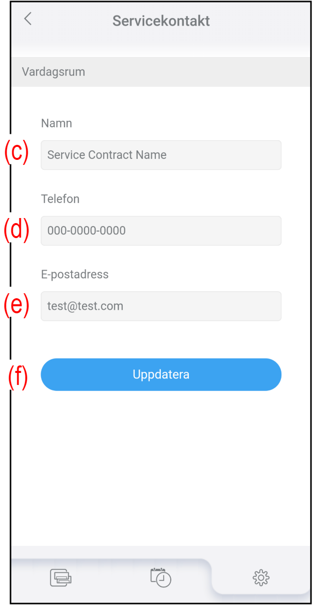 - Tryck på (a) på skärmen ”Inställning” för att kontrollera eller redigera servicekontaktinformationen.