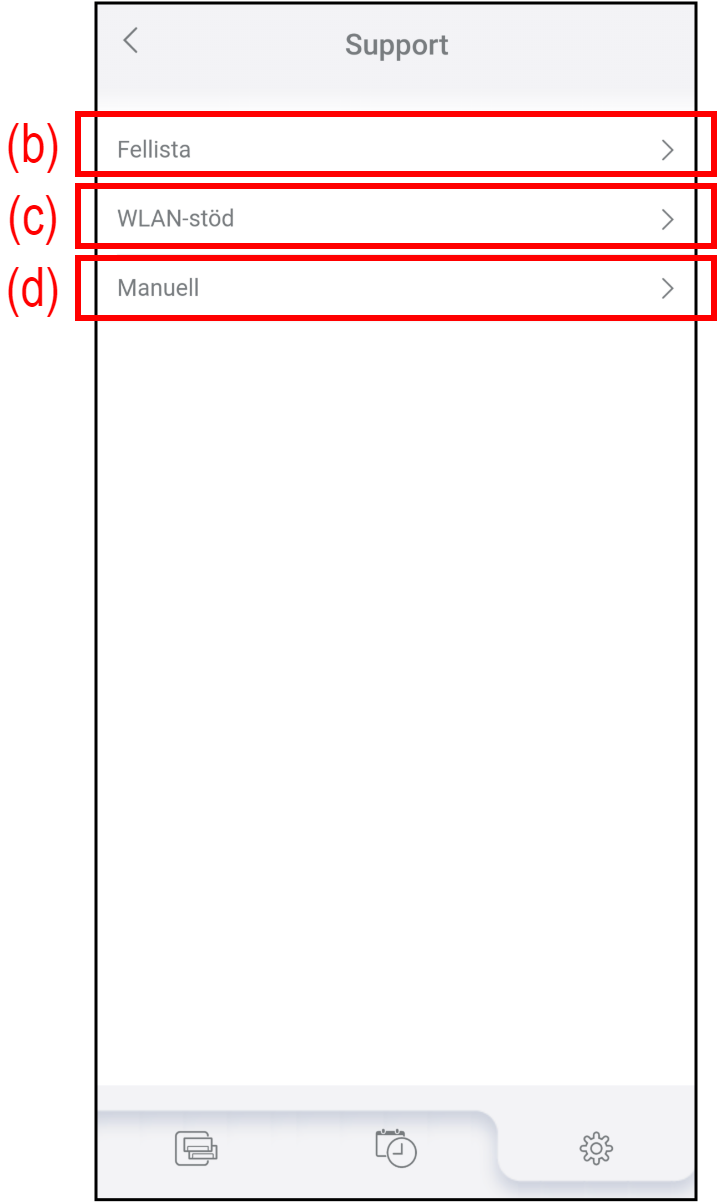 | (c) | WLAN-stöd | Du kan se supporten på vår webbplats för inställningar av trådlöst nätverk. |