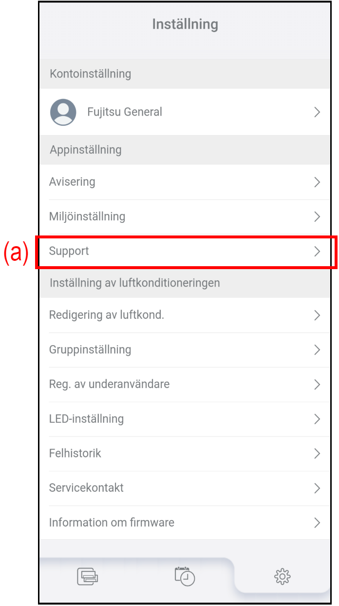 Tryck på (a) på skärmen ”Inställning” för att kontrollera supportinformationen.