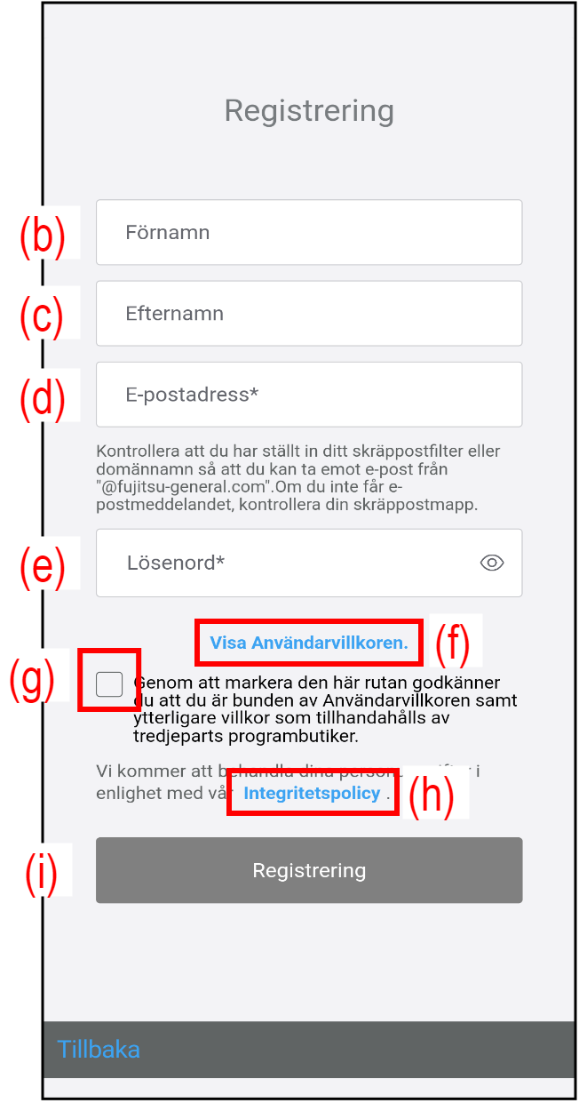 - Tryck på kryssrutan (g) för att godkänna tjänstevillkoren.