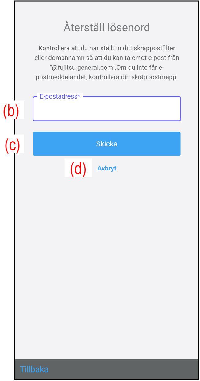 Tryck på den här knappen för att stänga skärmen utan att återställa lösenordet.Klicka på länken i e-postmeddelandet.