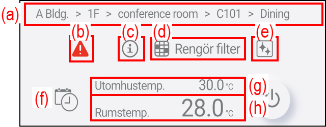 | (a) | Gruppnamn | Det visar namnet på gruppen som innehåller luftkonditioneringsapparaten. Om ingen grupp har ställts in visas inte denna post. |