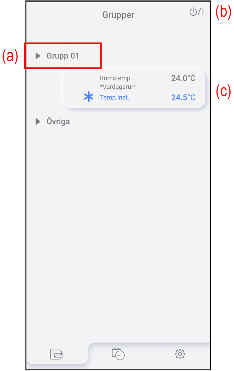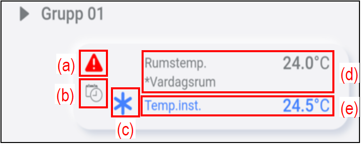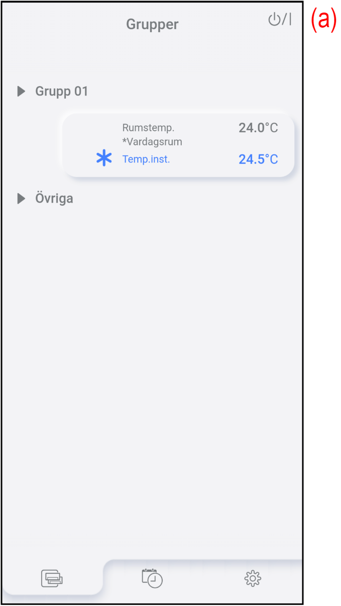 | (d) | Rumstemp. | Den visar den representativa inomhusenheten och rumstemperaturen uppmätt av den representativa inomhusenheten. Du kan ställa in den representativa inomhusenheten från fliken Inställningar > ”Gruppinställning” > ”Rumstemperaturvisning val av inomhusenhet”. |