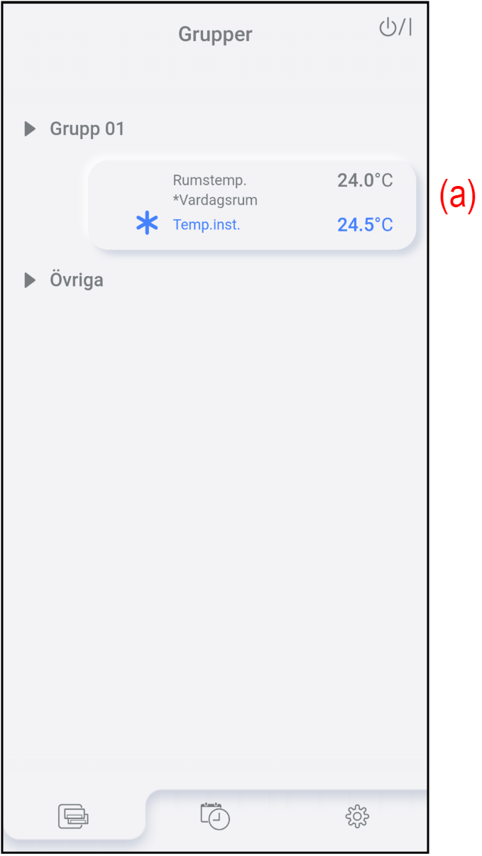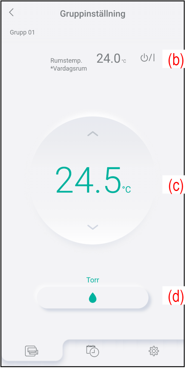 (b) Start/stopp Tryck här för att starta/stoppa driften. (c) Ställ in temperatur För att ändra inställd temperatur trycker du på [