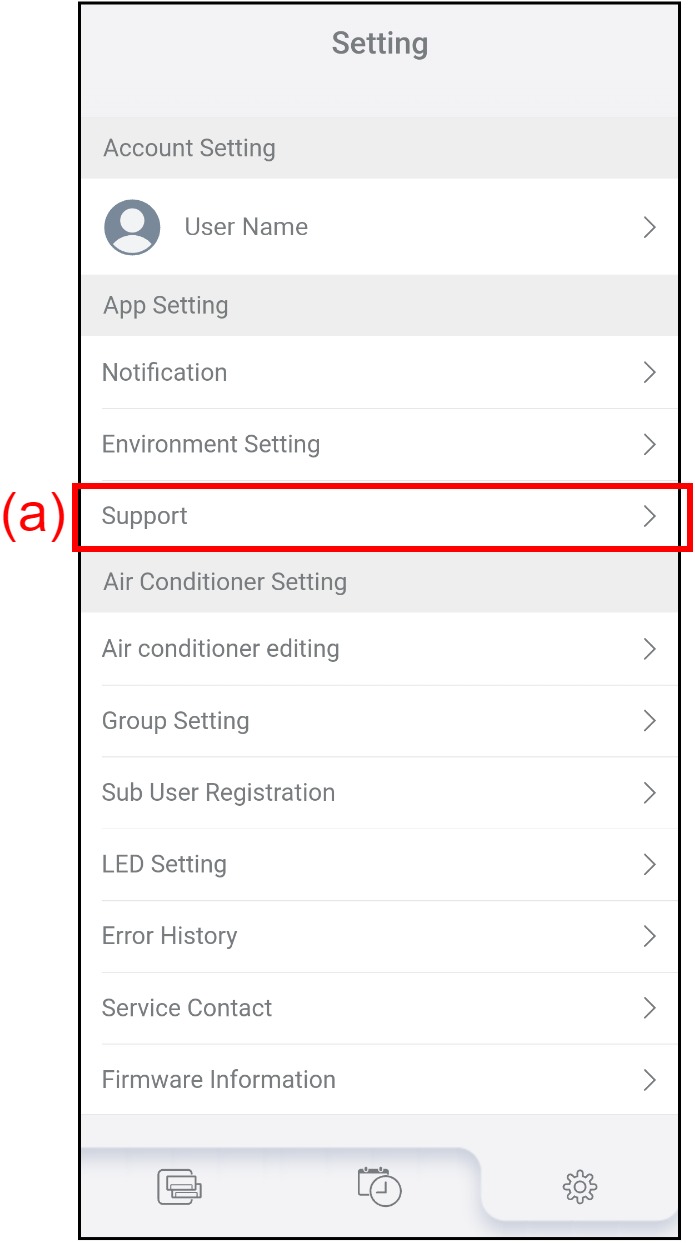 แตะ (a) บนหน้าจอ “Setting” เพื่อตรวจเช็คข้อมูลการสนับสนุน