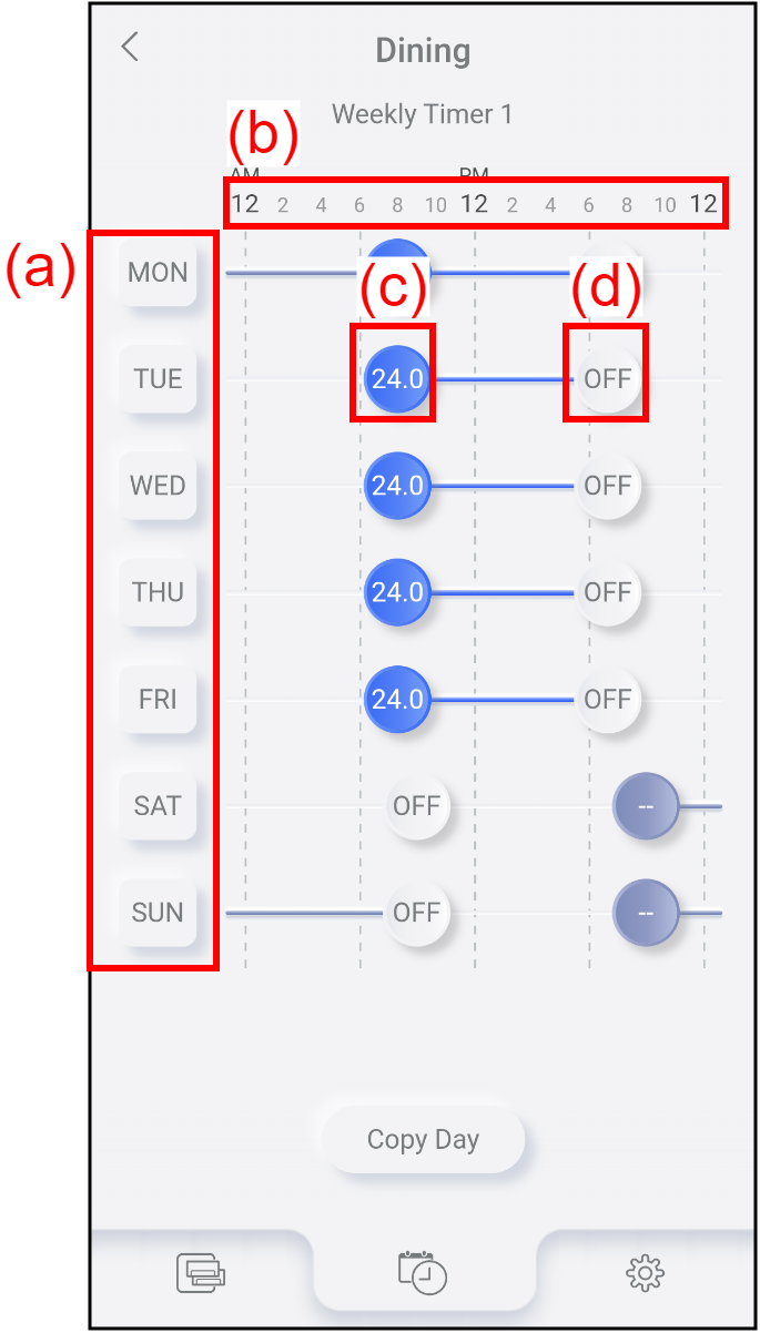 <รายการตั้งค่า>(d) Time ตั้งเวลาการทำงานแบบตั้งเวลา (e) Operation Setting OFF: เครื่องปรับอากาศหยุดการทำงานในเวลานั้น