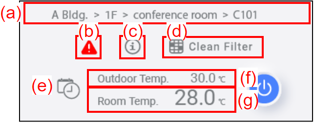 | (a) | ชื่อกลุ่ม | แสดงชื่อกลุ่มที่มีเครื่องปรับอากาศ หากไม่ได้ตั้งกลุ่มไว้ รายการนี้จะไม่แสดง |